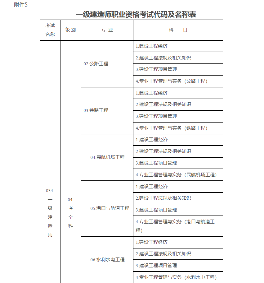 5.一級建造師職業(yè)資格考試代碼及名稱(chēng)表